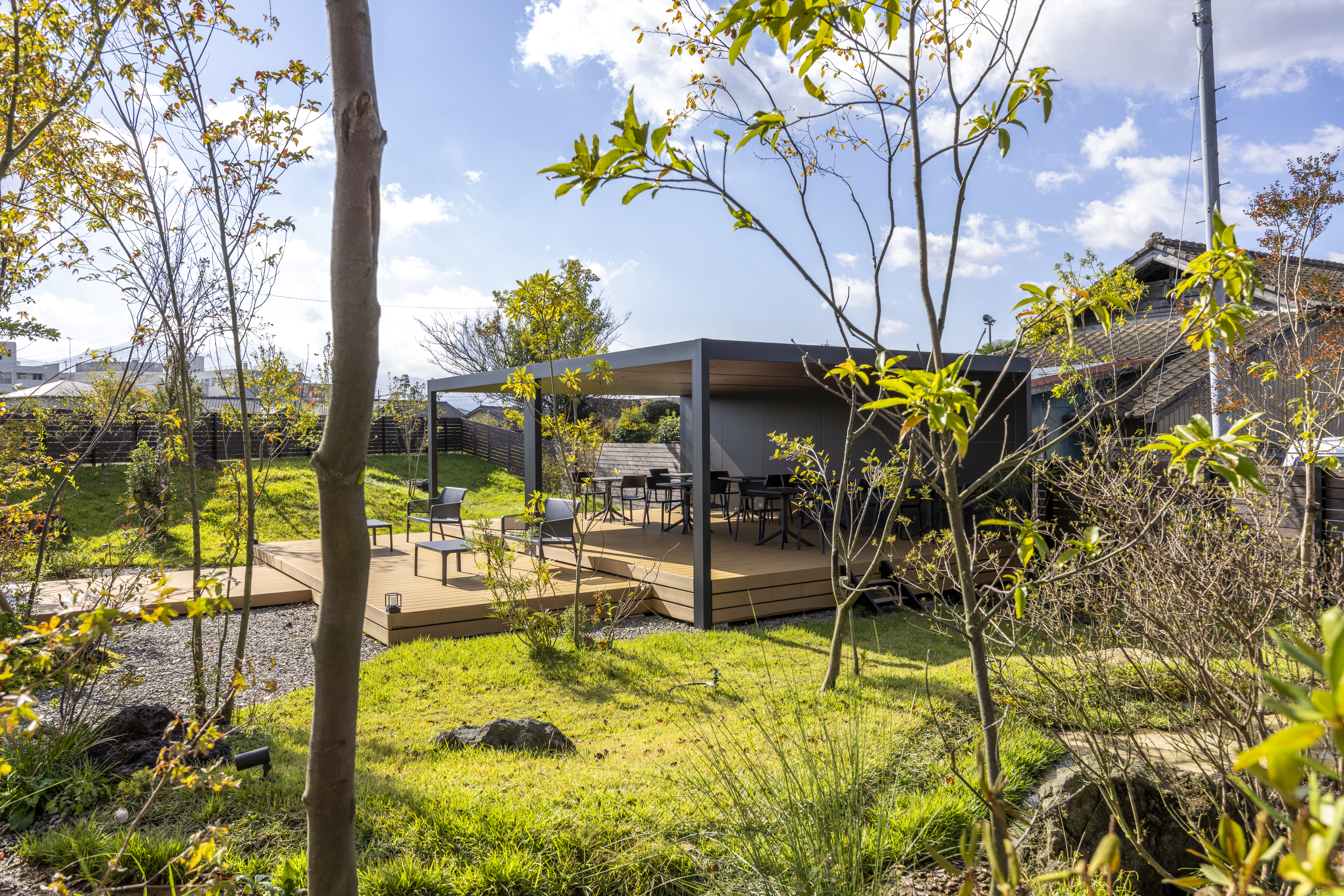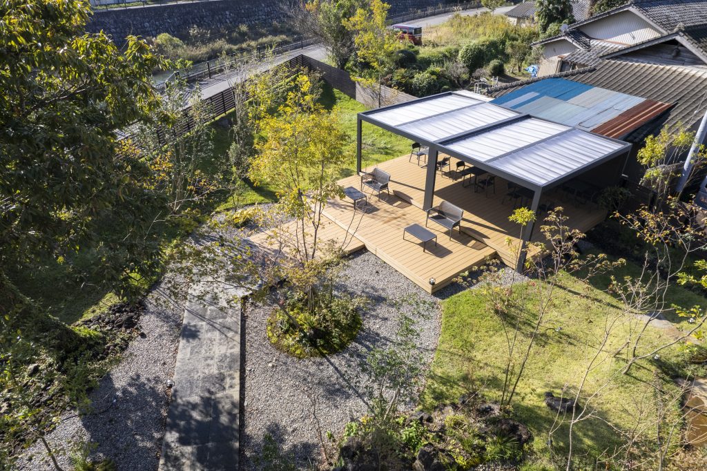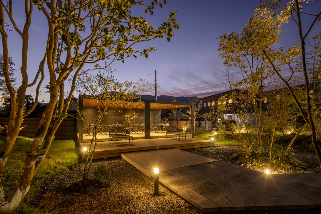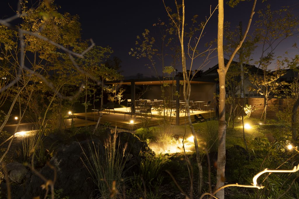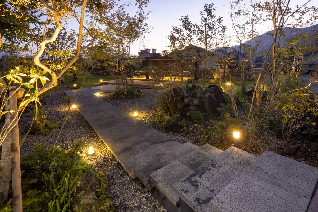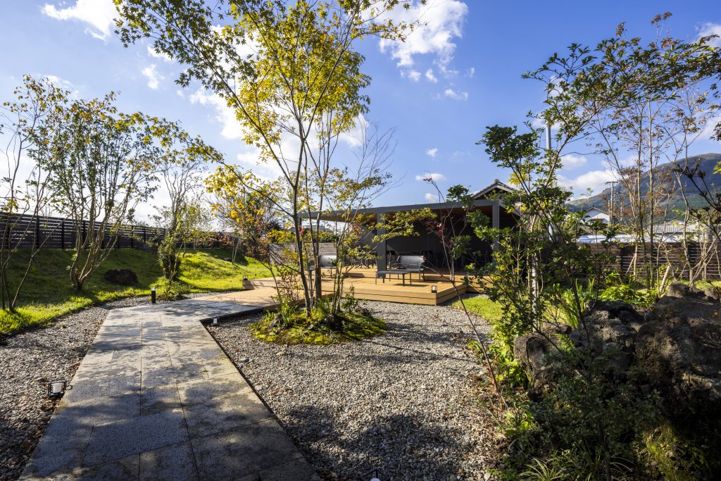 造園材料には阿蘇の溶岩石や阿蘇で育った樹木を使用し、訪れる方々に全身で阿蘇を感じてリラックスしていただける様な空間に仕上げました。